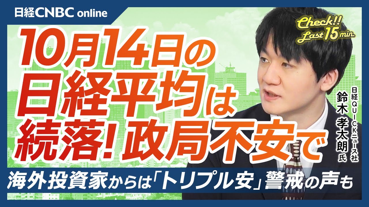 【10月14日(火)東京株式市場】日経平均株価は大幅続落/政治の不透明感広がる/海外投資家からはトリプル安警戒の声も/高市トレードならぬ玉木トレード?/良品計画、決算発表で逆行高/SBGは6%近く下落【日経CNBC】