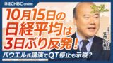 【10月15日(水)東京株式市場】日経平均株価は3日ぶり反発/高市銘柄中心に買い戻し/金上昇は米国スタグフレーション懸念?/AI関連はバブル状態か/パウエル氏講演で年内2回利下げか/QTの停止も示唆【日経CNBC】