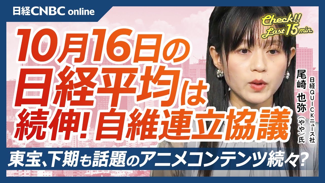 【10月16日(木)東京株式市場】日経平均株価は続伸/自民と維新で連立協議/大阪関連銘柄に買い/ベッセント氏による円安けん制/テクセンドIPO/東宝、決算で利益確定売りも下期も話題アニメ続々【日経CNBC】