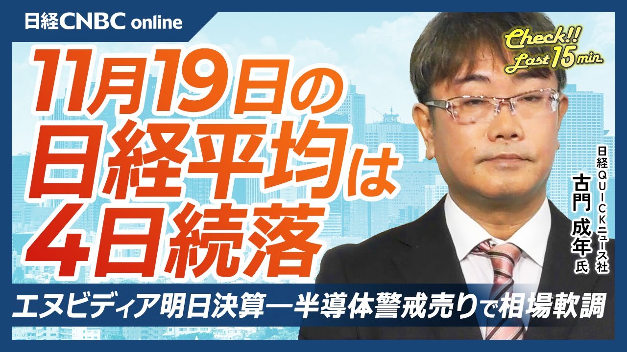 明日NVIDIA決算で分岐点か【11月19日(水)東京株式市場】日経平均は4日続落/キオクシアはAI関連期待と過剰投資で乱高下/日中対立で”水産物輸入停止”食品株売り目立つ/円安・金利上昇でトリプル安【日経CNBC】