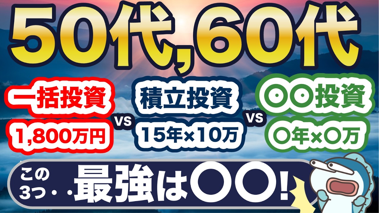 この動画では『50代、60代で1,000万円以上の差!?一括vs積立vs第3の投資法、徹底比較!』を学べます!