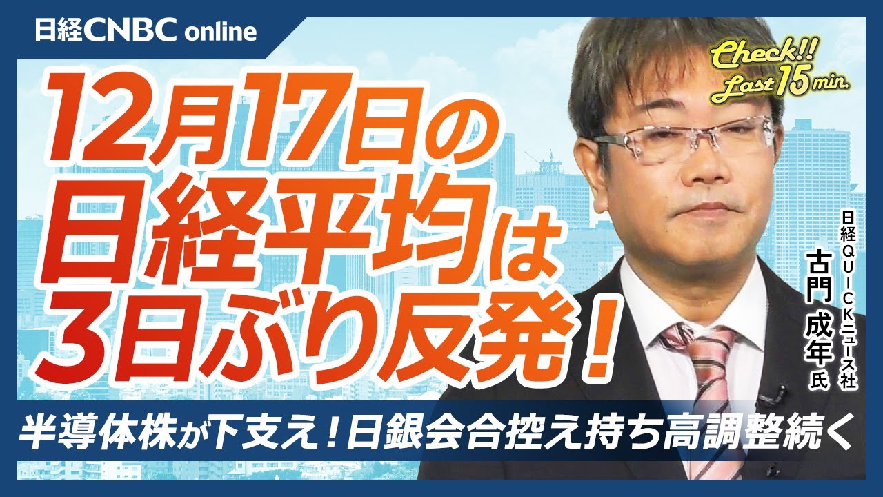 【12月17日(水) 東京株式市場|日経平均株価は3日ぶり反発!】半導体株が支える!日銀会合控え持ち高調整か/SBI新生銀初値は9%を上回り順調な滑り出し/今後の利上げペース次第で円相場や株価に影響【日経CNBC】