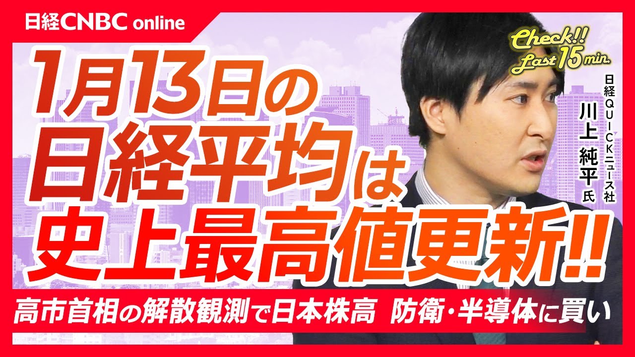 【1月13日 (火)東京株式市場】日経平均株価は史上最高値更新!/「通常国会冒頭で解散検討」報道で買いが加速/長期金利2.16%まで上昇しメガバンクも急伸/レアアース関連がテーマ株として再燃か【日経CNBC】