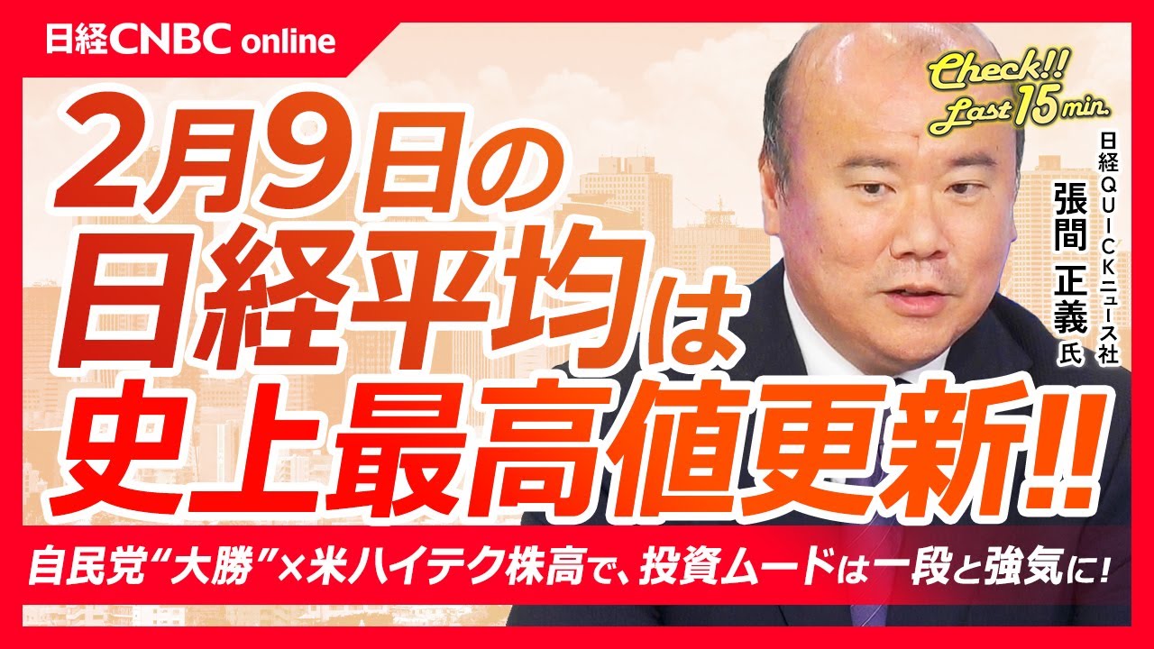 【2月9日 (月)東京株式市場】日経平均株価は史上最高値!/自民党“大勝”と米ハイテク高が追い風/ISM製造業指数が3年5ヶ月ぶりの高水準へ/JPモルガン年末目標を上方修正/三菱重や川重防衛関連に買い【日経CNBC】