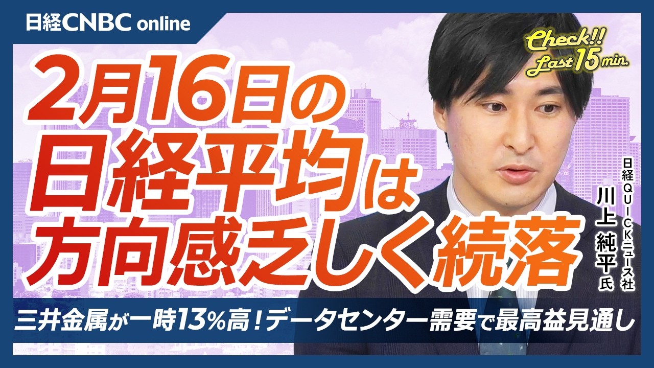 【2月16日(月)東京株式市場】日経平均は5万7000円攻防/三井金属が一時13%高、データセンター需要で最高益見通し/利下げ観測意識で米CPIが市場予想下回る/半導体:ディスコは売買代金が過去最大に【日経CNBC】