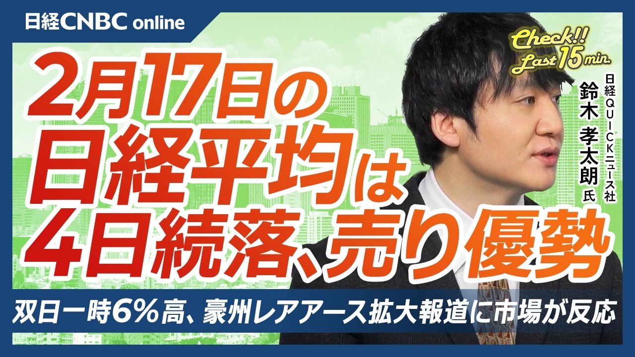 【2月17日(火)東京株式市場】日経平均株価は4日続落/OpenAI期待の一服+米ソフトウェア株安でSBG下落/双日、豪州レアアース輸入拡大報道で一時6%高/松屋フーズは公募増資で需給悪化懸念から下落【日経CNBC】