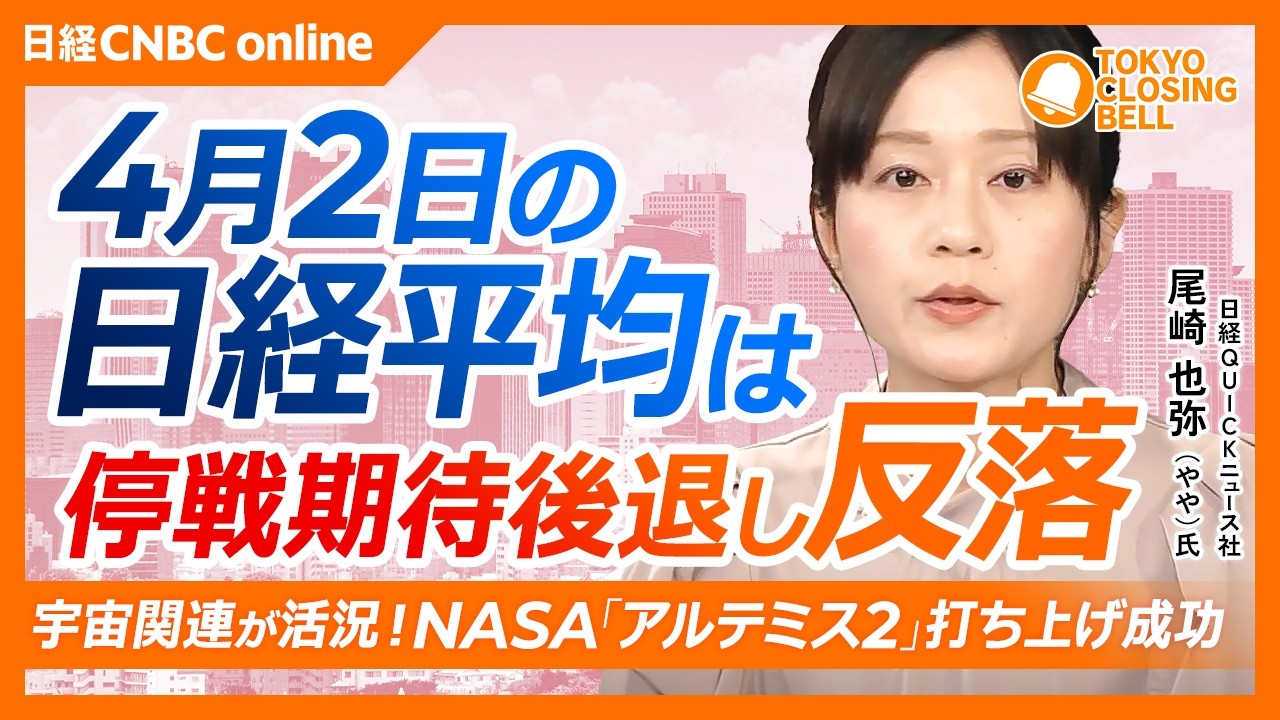 【4月2日(木)東京株式市場】日経平均株価は反落/トランプ大統領の演説で早期終結の期待が後退/トランプ大統領「NATO脱退検討」防衛関連に買い/宇宙関連が活況、NASA打ち上げ成功・スペースX上場申請【日経CNBC】