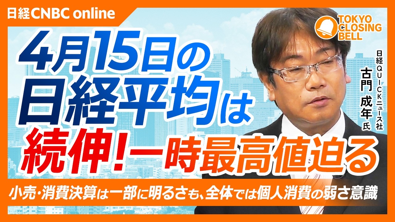 【4月15日(水)東京株式市場】日経平均株価は続伸!一時最高値迫る場面も/東宝は前期の反動懸念から減収減益見通しを嫌気し安値更新/小売・消費関連決算に警戒感/トヨタ・ソニーG・任天堂などの株価は鈍い【日経CNBC】