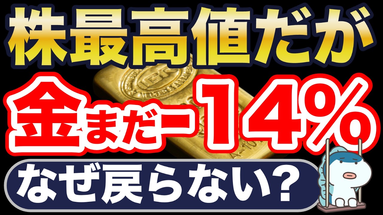 この動画では『株は最高値だが、金(ゴールド)はマイナス14%。なぜ戻らない?』を学べます!