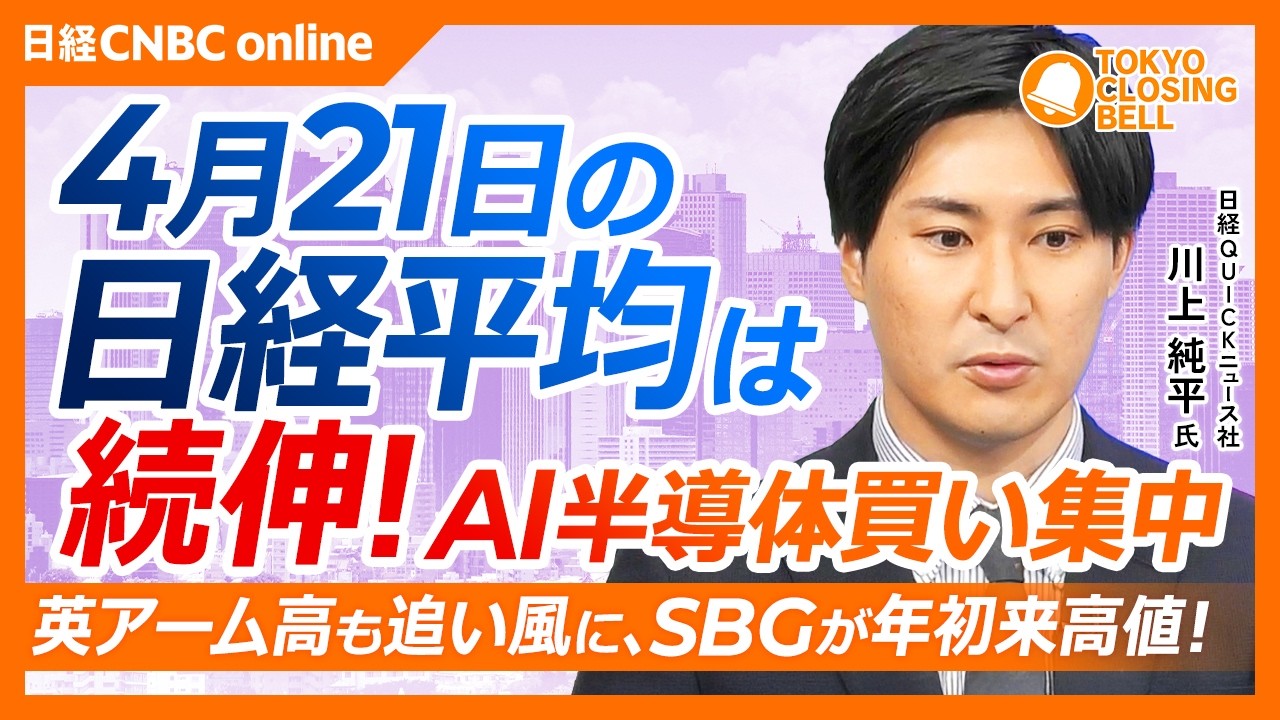 【4月21日(火)東京株式市場】日経平均株価は続伸!AI・半導体がけん引!5万9000円台回復も広がり欠く相場/英アーム高も追い風にSBG年初来高値更新/SOX指数は14日連続上昇/TOPIX上値重い【日経CNBC】