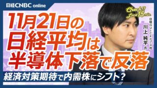日経CNBC 【11月21日(金)東京株式市場】日経平均株価は反落/米ハイテク株安で日本株も半導体関連下落/SBGは75日移動平均線を下回る/不透明感続く米12月利下げ/政府の経済対策期待で内需株へ資金シフト【日経CNBC】