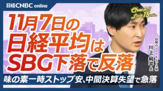【11月7日(金)東京株式市場】日経平均は反落/米国の半導体関連の弱さから日本でも売り目立つ/フジクラ好決算も利益確定売りで下落/味の素冷凍食品不振で決算振るわずストップ安/日産自は販売不振の警戒続く【日経CNBC】マーケット・経済専門チャ...