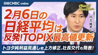 日経CNBC 【2月6日(金)東京株式市場】日経平均株価は3日ぶり反発/TOPIXが最高値圏/防衛関連が相対強い一方、ソフトウェアは続落/アマゾン決算好調でも“巨額投資”に警戒/トヨタ決算発表は上方修正&社長交代【日経CNBC】
